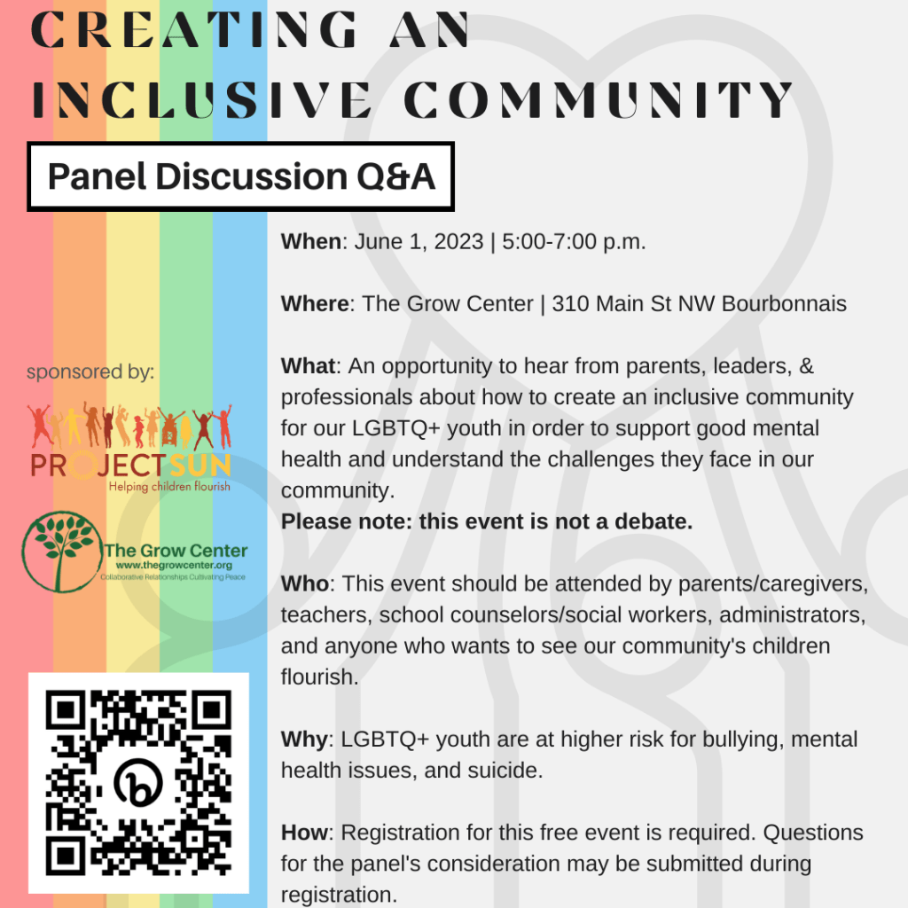 This panel discussion/Q&A event by the Cultural Competency Workgroup of Project SUN Kankakee is about Creating an Inclusive Community for our LGBTQ+ youth in Kankakee County. This event is intended to help you better understand the issues LGBTQ+ youth face and what can be done to help them flourish. It will take place on June 1, 2023, from 5:00-7:00 p.m. at The Grow Center (310 Main St. NW, Bourbonnais), right after the end of Mental Health Awareness Month and at the start of Pride month, bridging those two areas of awareness.