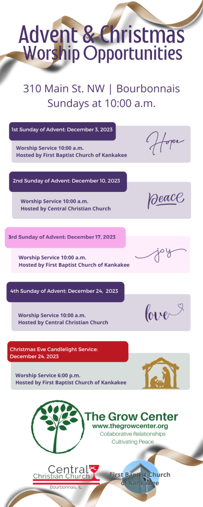 The two congregations who meet at The Grow Center will each be hosting Advent and Christmas services in December. Each worship service is at 10:00 a.m. on Sundays, and there will be a candlelight service on Christmas Eve at 6:00 p.m.